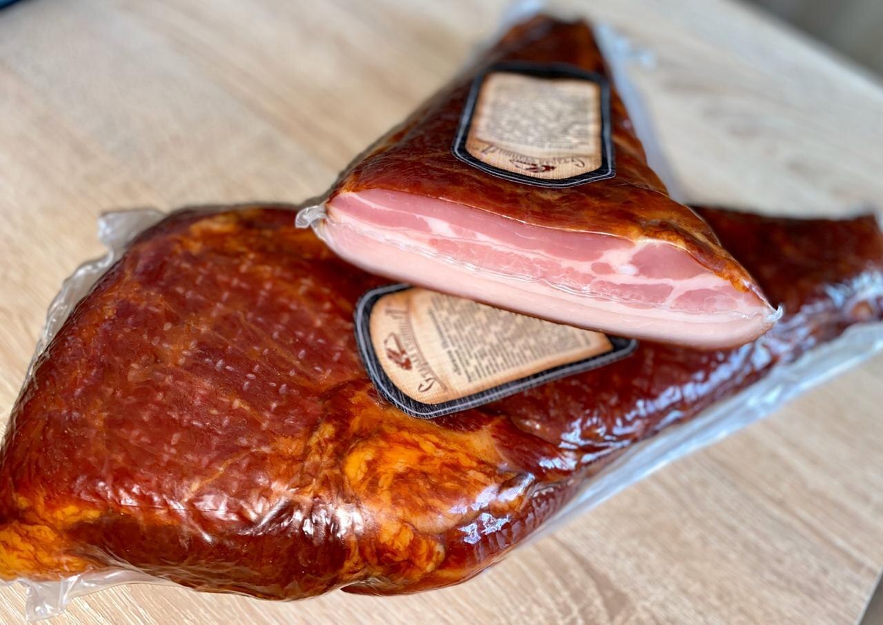 Состав: грудинка свиная, экстракты специй (тмин, можжевеловая ягода), соль, черный перец, красный лук.