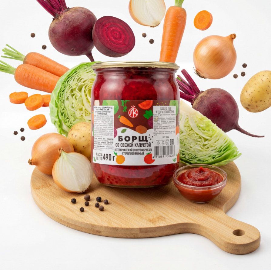 Богат овощами: свекла, капуста и картофель создают густую и насыщенную текстуру. Вегетарианская рецептура подходит для постного и повседневного меню. Удобен в хранении и быстр в приготовлении.