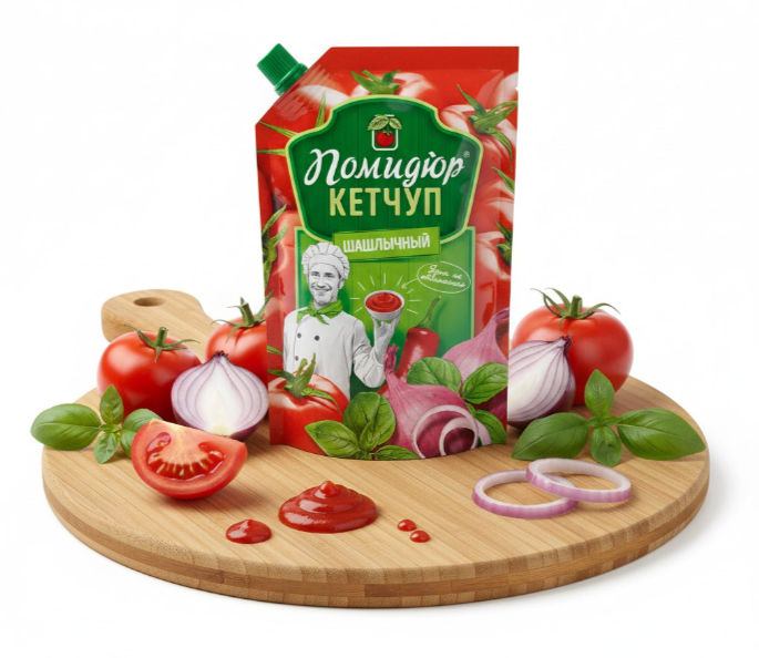 Состав: вода питьевая, томатная паста, сахар, уксус спиртовой 9%, загуститель крахмал модифицированный Е1442, соль йодированная, пряности, клетчатка картофельная, сушеные лук и чеснок, консерванты: сорбат калия, бензоат натрия.
