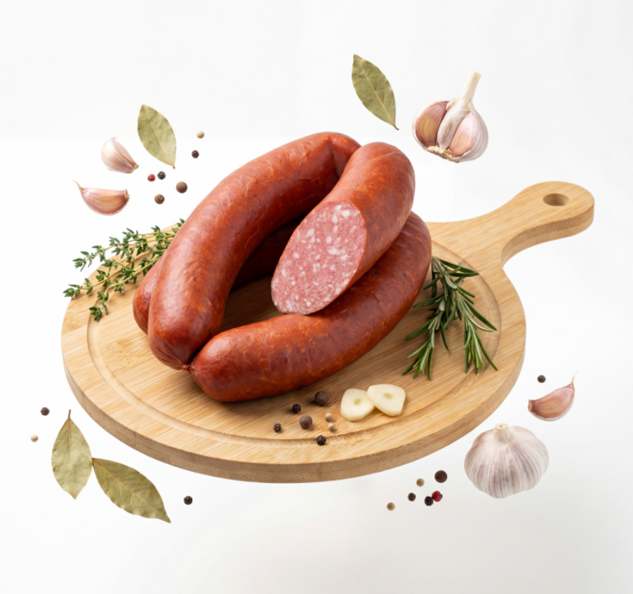 Состав: Свинина (в том числе соединительная ткань), шпик свиной, мясо цыпленка-бройлера механической обвалки, посолочная смесь (соль, нитрит натрия фиксатор окраски), молоко сухое, чеснок, пряности и их экстракты, смесь белков: говяжий, яичный, смесь сахаров (в том числе лактоза), белок, волокна растительные, стабилизатор Е450, Е452, регулятор кислотности Е451, Е575, антиокислитель Е300, Е301, Е316, Е330, усилитель вкуса Е621, Е627, Е631, экстракт дрожжей, эмульгатор Е471, Е472с, загуститель Е407, Е407а, Е410, Е415, Е425, Е466, ароматизаторы, краситель красный рисовый, Е120, антислеживатель Е536, Е551.