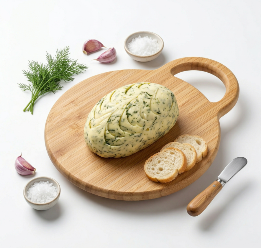 Натуральное сливочное масло с добавлением свежего укропа и чеснока, приготовленное из пастеризованных сливок. Обладает мягкой кремовой текстурой и насыщенным сливочным вкусом с ароматными нотками укропа и чеснока. Идеально подходит для намазки на хлеб, приготовления соусов или добавления к горячим блюдам.