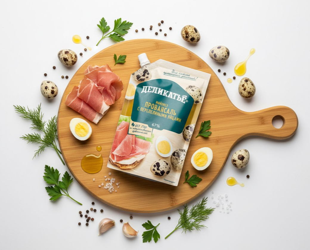 Состав: масло подсолнечное рафинированное дезодорированное, вода питьевая, уксус спиртовой 9%, продукты яичные сухие (яичный желток, меланж из перепелиных яиц), соль йодированная, горчичный порошок, регулятор кислотности лимонная кислота, консервант сорбат калия, краситель каротин*, загуститель ксантановая камедь, подсластители: ацесульфам калия и сахаринат натрия; декстроза, экстракт паприки. Изготовлен из натурального сырья, является провитамином витамина А. Массовая доля жира - не менее 67%.