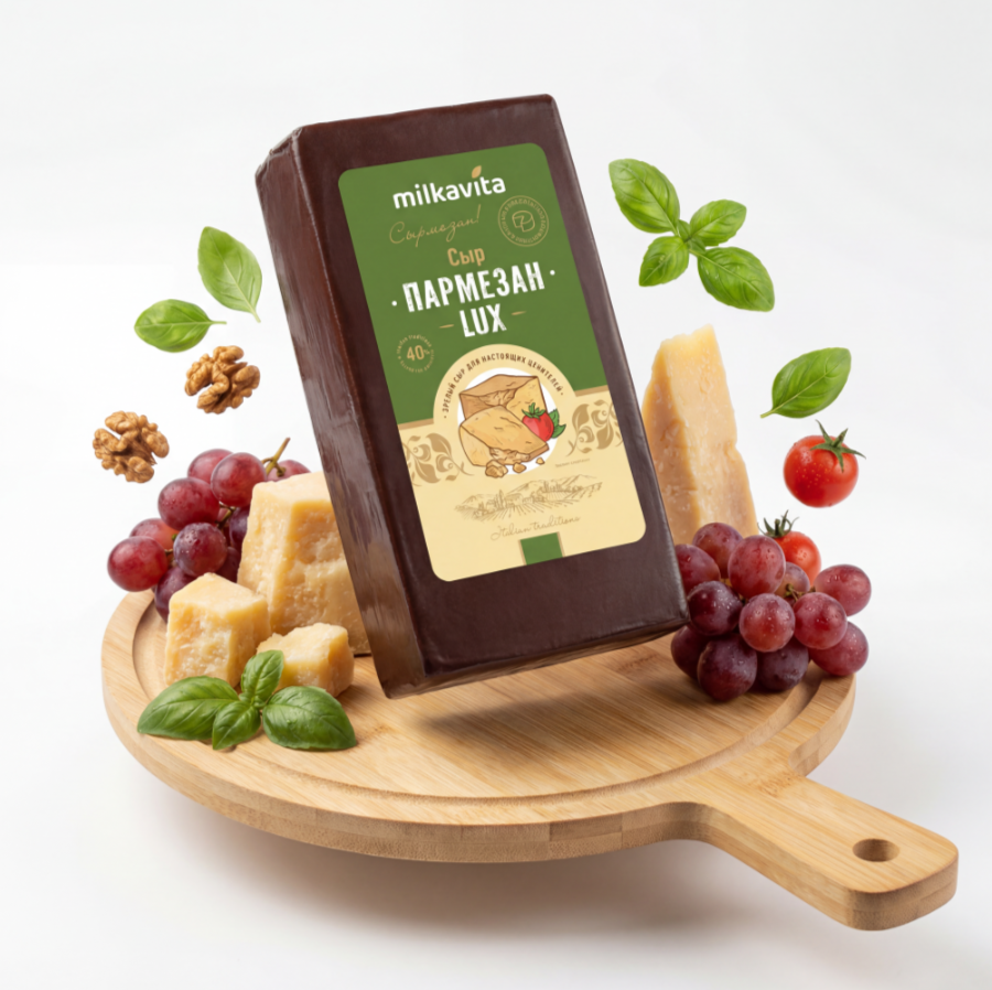 Твёрдый сыр «Пармезан Lux» с массовой долей жира в сухом веществе 40% характеризуется ярким насыщенным вкусом и плотной текстурой. Подходит для натирания, приготовления соусов и запекания, а также как самостоятельная закуска.