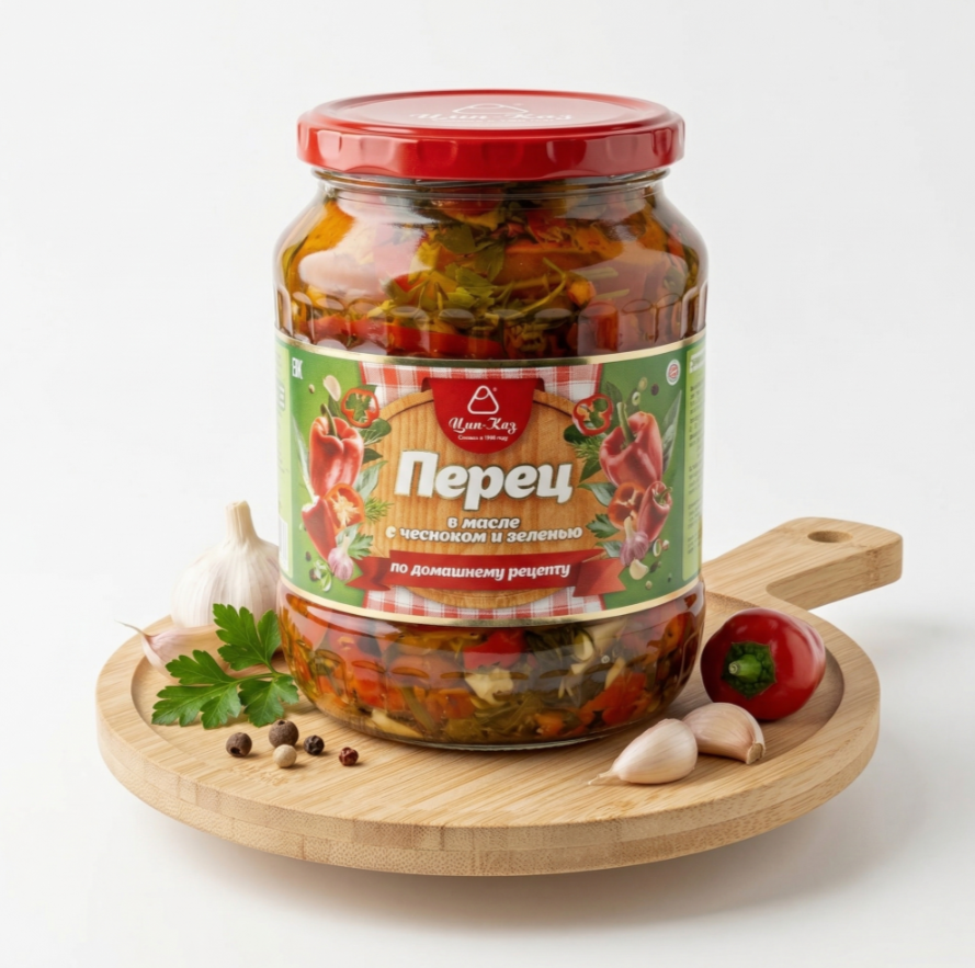 Стерилизованный продукт из свежего сладкого перца с добавлением чеснока и зелени (укропа и петрушки), маринованный в подсолнечном масле с легкой остротой стручкового перца. Обладает насыщенным ароматом и гармоничным сочетанием сладости, пряностей и свежей зелени. Идеален в качестве закуски, гарнира или дополнения к мясным и овощным блюдам.