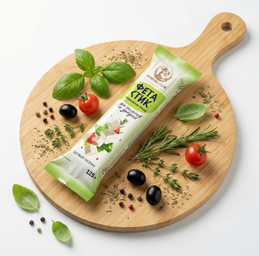 Сыр Burenka Club Фета легкий с прованскими травами 35% в функциональной упаковке «стик» — это сыр с добавлением букета прованских трав, таких как тимьян, майоран, чабер, базилик, орегано, розмарин, шалфей и мята. Этот продукт идеально подходит для здорового питания, обладая сбалансированным сливочно-соленым вкусом с легкими пикантными нотками и нежным ароматом трав. Мягкая текстура сыра прекрасно сохраняет форму, что делает его удобным для использования в салатах, пастах, закусках и канапе.