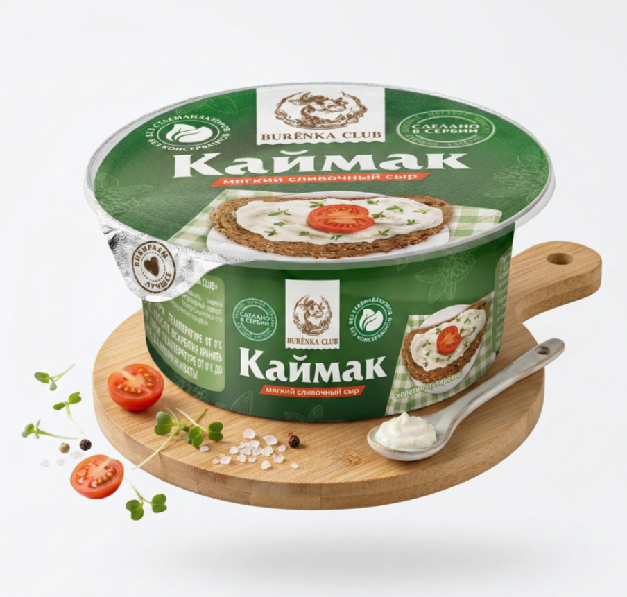 Каймак BURЁNKA CLUB — это густой, сливочный продукт с легкой кислинкой, тающий во рту и являющийся гастрономической гордостью Балкан. Сыр производится по традиционному сербскому рецепту из свежайшего коровьего молока, без красителей и консервантов, что позволяет сохранить насыщенный сливочный вкус и текстуру. Каймак идеально подходит для завтрака с теплым хлебом, овощами и зеленью, а также используется для соусов, придавая им кремовую текстуру и насыщенный вкус. Это не просто еда, а часть сербской истории и традиций.