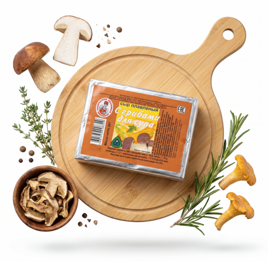 Состав: сыр полутвердый, масло сливочное, вода, сыр нежирный для плавления, сметана, молоко сухое обезжиренное, соли плавители («Фонакон», натрий фосфорнокислый двузамещенный), комплексная пищевая добавка «Грибы», творог, ароматизатор идентичный натуральному.