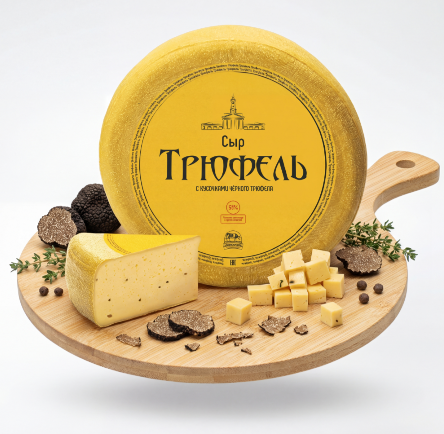 «ТРЮФЕЛЬ»- авторский сыр, уникальный продукт способный приятно удивить. Мы используем натуральный черный трюфель, тот самый деликатес, который гурманы в дорогих ресторанах заказывают в качестве изысканной приправы. Считается, что черные трюфели способны пробуждать чувственные ассоциации и специфические желания. Аромат настоящих грибов напоминает букет запахов, в которых угадываются грецкий орех, мох, ягоды, опавшая листва на лесной почве. Трюфель - полутвердый сыр, светло-желтого оттенка, с изысканным сливочным вкусом с кусочками натурального черного трюфеля, на разрезе могут попадаться небольшие дырочки. Корочка сыра натуральная, плотная, в пищу ее не употребляют.
