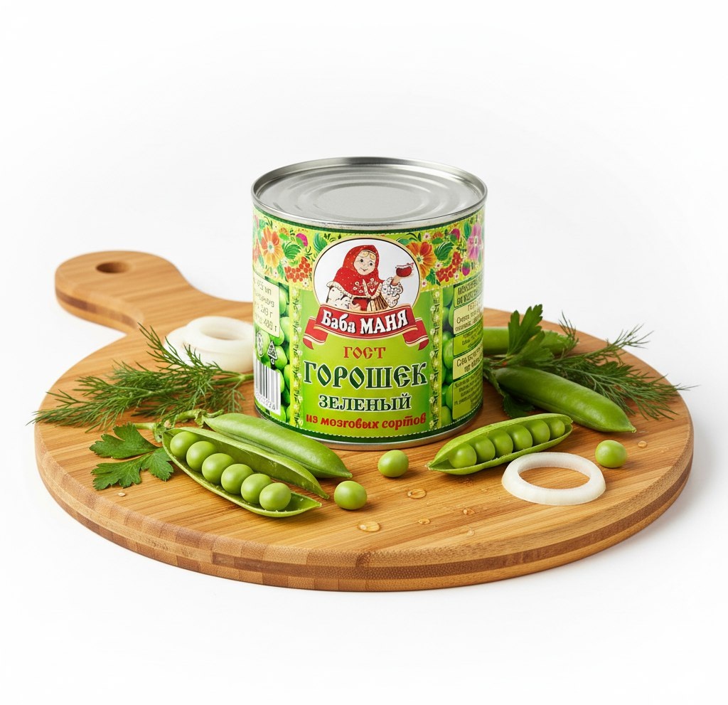 Горошек зеленый Баба Маня произведен из молодых зерен специальных сортов горошка, собранных в молочной стадии зрелости, когда зерна особенно нежны и наиболее богаты сахаром и витаминами. Отлично дополняет мясные и овощные блюда, салаты и закуски.
